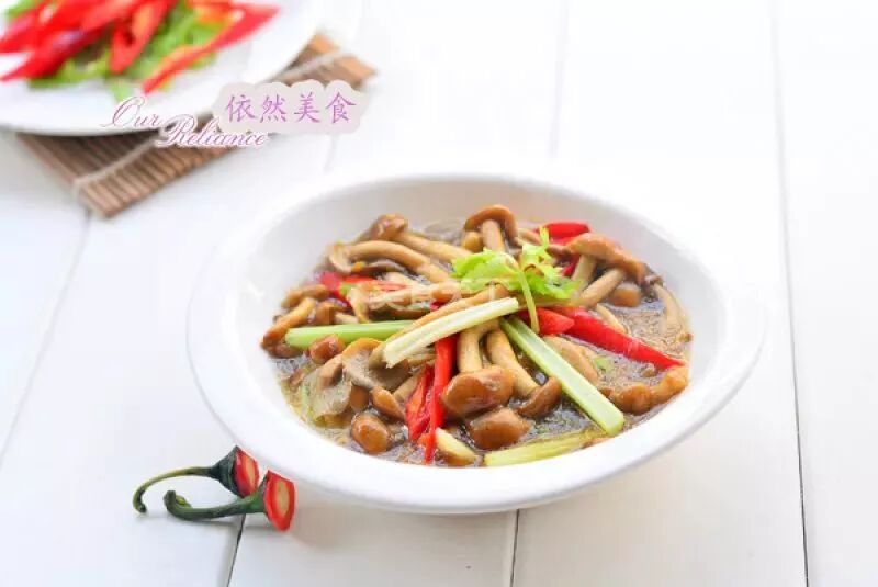 滑菇350克,红辣椒2个,芹菜2棵,生姜、植物油、盐、昆布调味粉适量