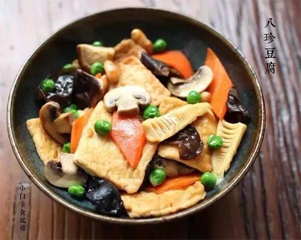 老豆腐 一块,鲜笋 一根,胡萝卜 半根,青豆 一小把,口蘑 两三个,香菇 两朵,花生 少许,木耳 少许,姜 两片,盐 1/2小匙,生抽 2小匙,冰糖 2块,白胡椒粉 1点点