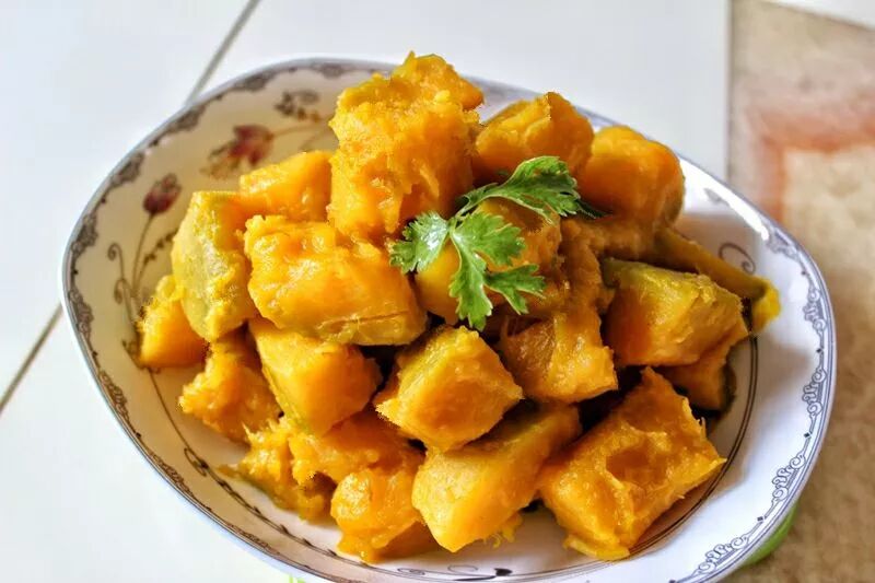❶ 将南瓜洗净,去皮切块,姜切丝