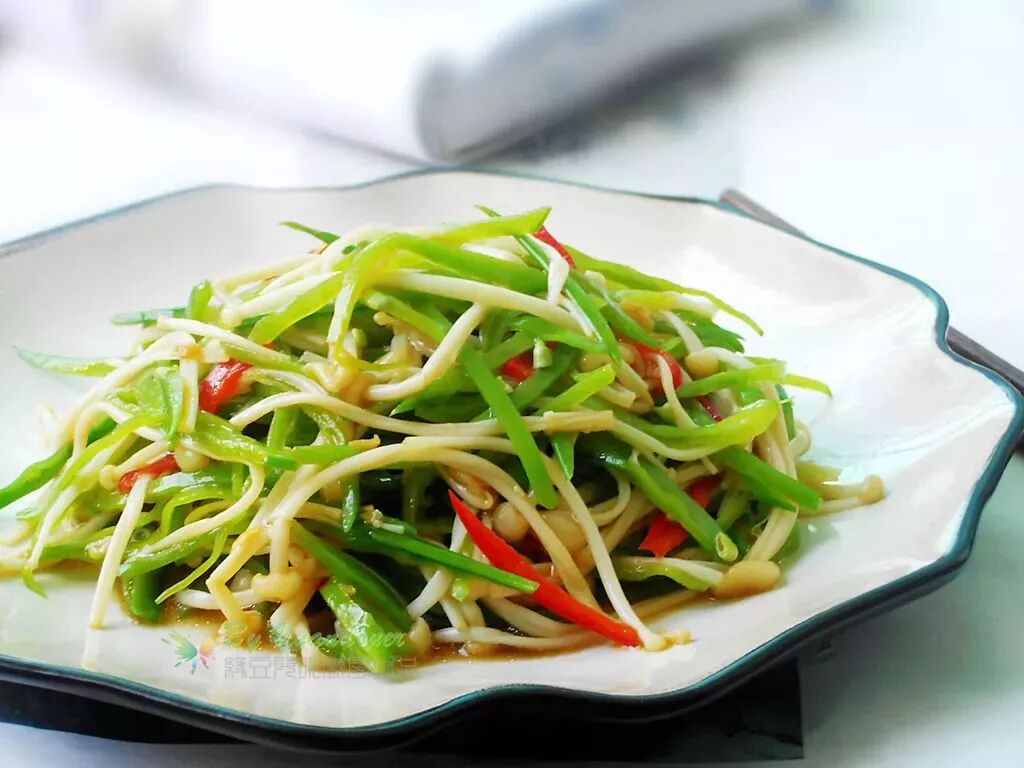 ❶ 荷兰豆洗净去筋切丝,红椒切丝,生姜切丝,金针菇切去根部洗净