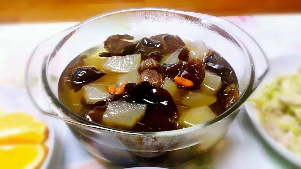 冬瓜一块,干木耳两把,干花菇一把,红枣一把,枸杞半把,盐、香油适量