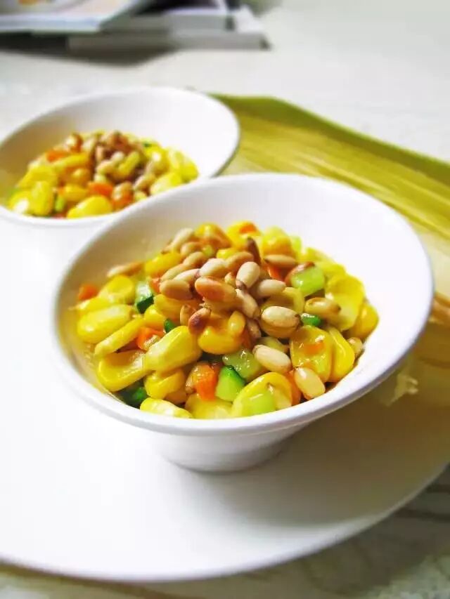 ❸ 锅中放少许油,放入玉米,黄瓜丁,胡萝卜丁一起翻炒,放入少许盐、蔬果粉调味,水淀粉勾薄芡,最后撒入炒好的松仁即可。