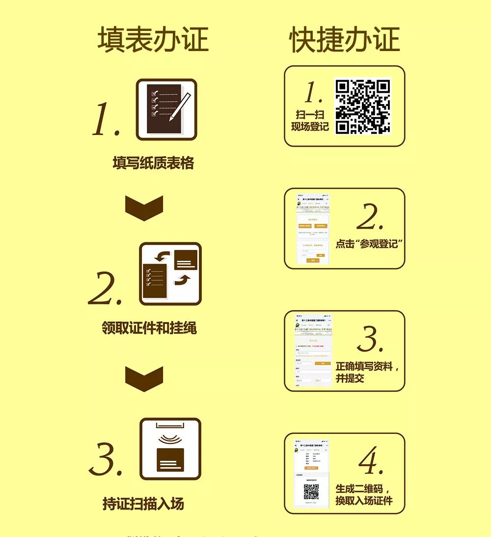 已预登记观众凭【二维码或手机号】及【身份证/护照等有效证件】,直接前往已预登记窗口领取来宾证,并可获赠大会茶歇券一张。佩戴证件后,在展厅入口处扫码入场。