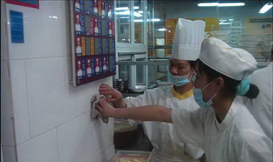 1、每人身边一个垃圾筐。除了在墙边有个大的垃圾桶外,打荷、砧板身边每人一个小的四方形垃圾筐,随手可及。避免繁忙时员工不愿多跑或来不及去垃圾箱丢废物,就直接扔到地上影响地面的清洁。