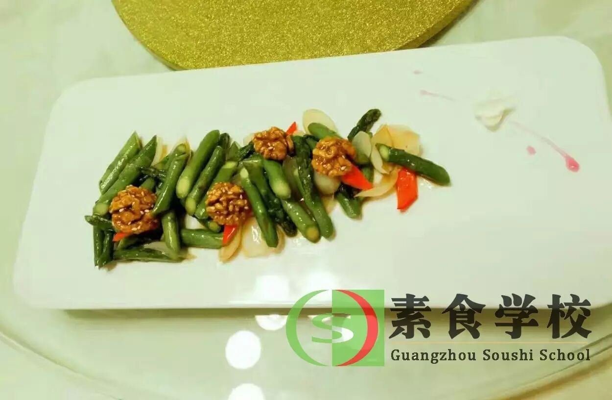 2.烧锅下红椒件,芦笋段稍炒后下盐下适量水,加上盖子煮2分钟后再放入鲜百合略炒数下即上碟,再撒上炸好的核桃即可。