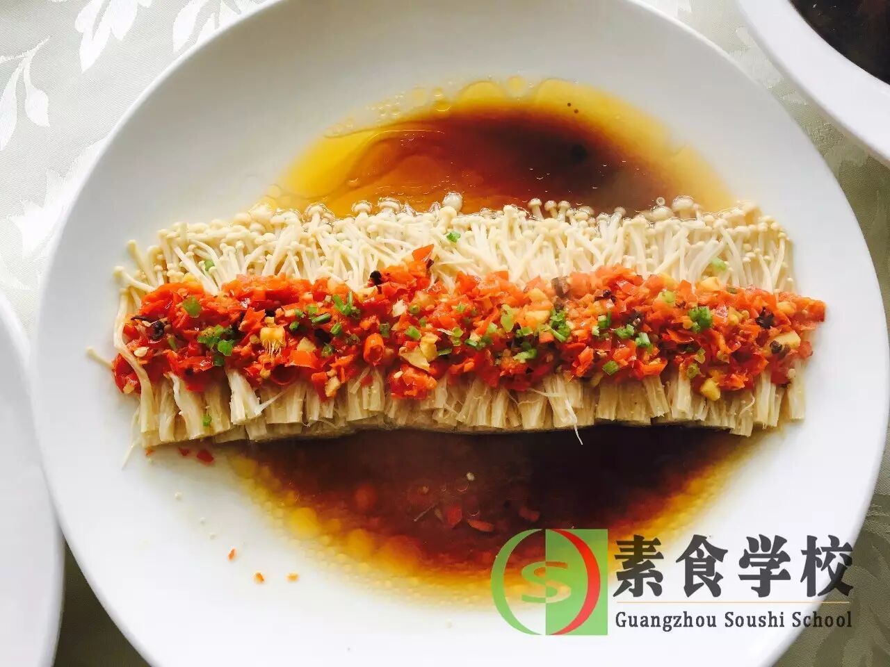 2.将洗净已去老脚的金针菇整齐排放在碟上,剁碎的剁椒调入香油、生抽等淋在金针菇上,隔水蒸15分钟取出即可。