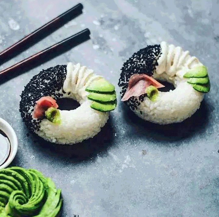 在甜甜圈的模具抹上一层椰子油,再把各色的米饭填进去塑型。出模后加上芝麻,牛油果,酸姜,芥末和腰果美乃滋酱,搞定!